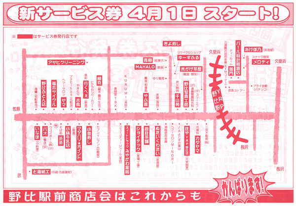 新サービスといたしまして「サービス券」の発行を4月1日より開始いたしましたので、どうぞご利用ください! ★ サービス券発行店ではお買上げ500円ごとに5円券を1枚差し上げます。 ★ サービス券は金額に応じて5円券・10円券・20円券・50円券がございます。 ★ サービス券の有効期限は平成24年(2012年)9月30日までです。 ★ サービス券発行店は上記地図をご参照ください。 ※各店舗により発行条件が異なる場合があります。詳細は各店舗にお問合せください。