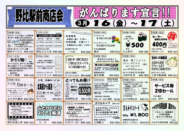 野比駅前商店会では季節ごとにSALEを行ってます。 また、餅つきや盆踊りなどさまざまなイベントも盛りだくさんです。 今年で商店会も40年を迎えましたますますがんばります。