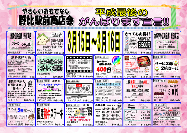 野比駅前商店会では季節ごとにSALEを行ってます。 また、餅つきや盆踊りなどさまざまなイベントも盛りだくさんです。 今年で商店会も40年を迎えましたますますがんばります。