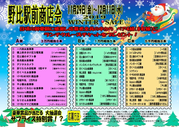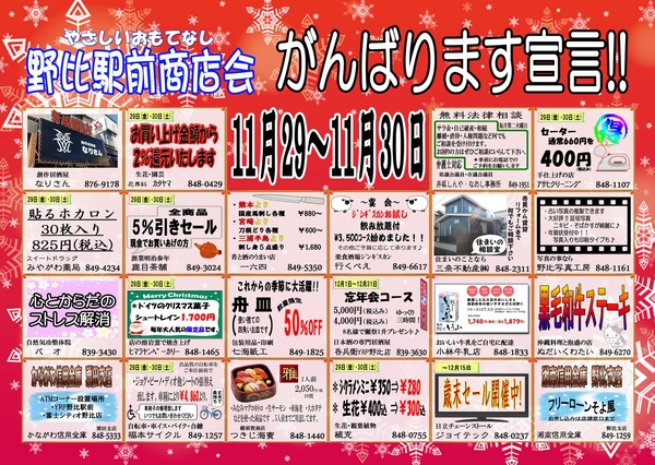 野比駅前商店会では季節ごとにSALEを行ってます。 また、餅つきや盆踊りなどさまざまなイベントも盛りだくさんです。 今年で商店会も40年を迎えましたますますがんばります。