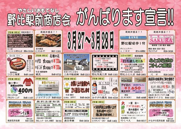 野比駅前商店会では季節ごとにSALEを行ってます。 また、餅つきや盆踊りなどさまざまなイベントも盛りだくさんです。 今年で商店会も40年を迎えましたますますがんばります。