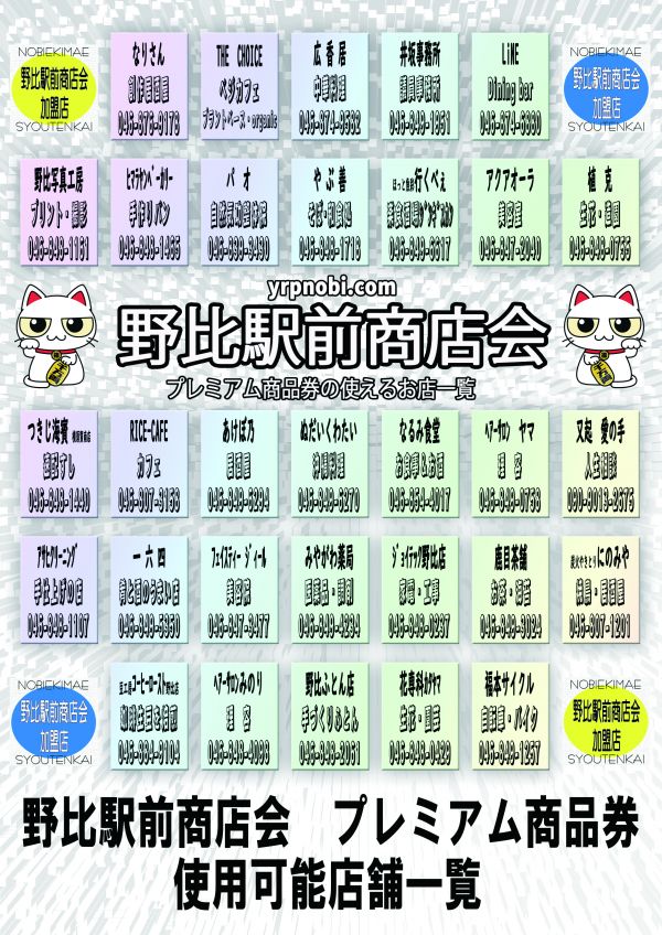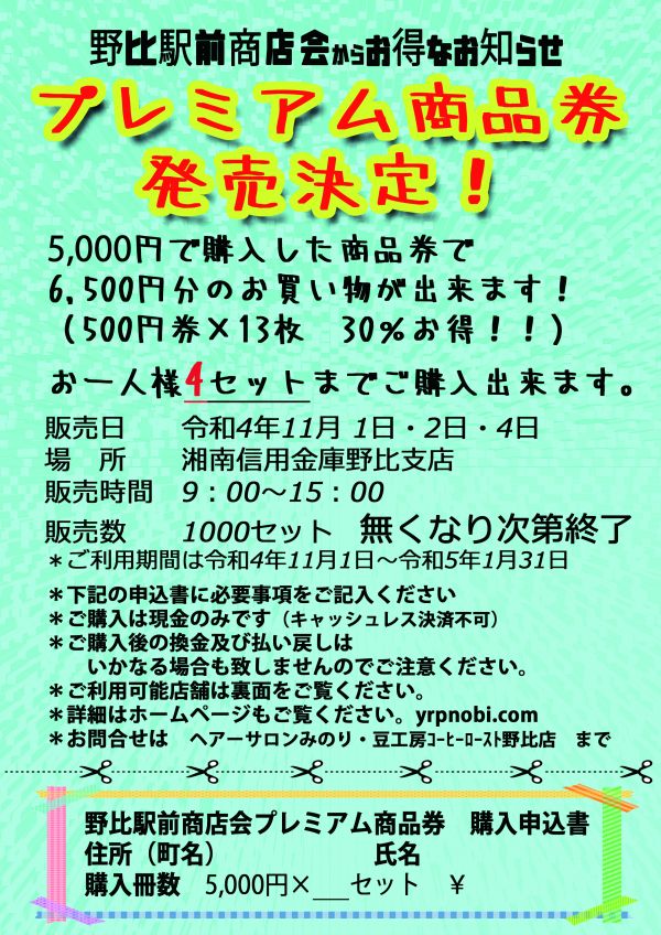 野比駅前商店会からお得なお知らせです。 5000円で購入した商品券で6500円分のお買い物が出来る プレミアム商品券の発売が決定しました。 (500円券×13枚) 販売上限 お1人様4セットまでご購入出来ます。 販売日 令和4年11月1日(火)2日(水)4日(金) ※ 1000セットなくなり時点で終了となります。 場所 湘南信用金庫 野比支店 ※商品券使用期間 令和4年11月1日 ~ 令和5年1月31日 ※チラシの購入申込書をご記入の上お持ち下さい。 ※ご購入は現金のみになります。(キャッシュレス決済不可) ※ご購入後の換金及び払い戻しは一切出来ませんのでご注意下さい。 ※商品券ご利用可能店舗はチラシ裏面又はホームページにてご確認お願い致します。 ※お問い合わせはヘアーサロンみのり・豆工房コーヒーロースト野比店までお願い致します。