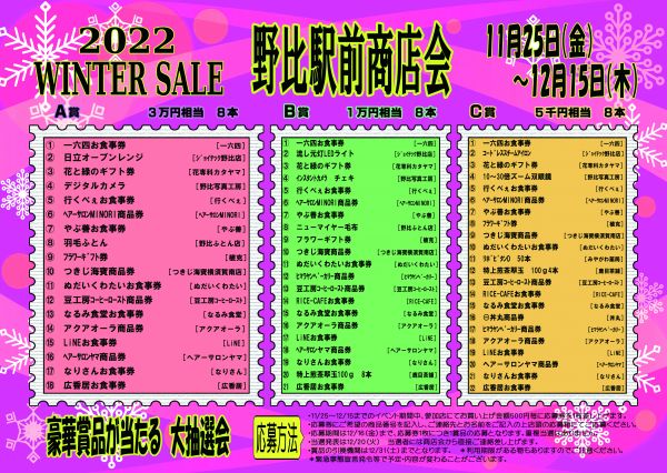 野比駅前商店会では季節ごとにSALEを行ってます。 また、餅つきや盆踊りなどさまざまなイベントも盛りだくさんです。 今年で商店会も40年を迎えましたますますがんばります。