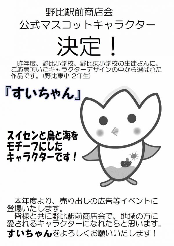 2022年に商店会役員会にて 野比駅前商店会のマスコットを 作ろうじゃないかとの案が出まして キャラクターデザインを地元である ・野比小学校 ・野比東小学校 2校の生徒さんにご応募頂きました! たくさんの作品の中から… 野比東小学校2年生の生徒さんの作品 水仙と鳥と海をモチーフにした 「すいちゃん」に決定いたしました! ご応募にご協力いただいた生徒のみなさん ほんとにありがとうございました 「すいちゃん」はチラシや広告 イベント等に登場いたします 地域の方に愛されるキャラクターになれたら 嬉しく思います 「すいちゃん」をよろしくお願いいたします!