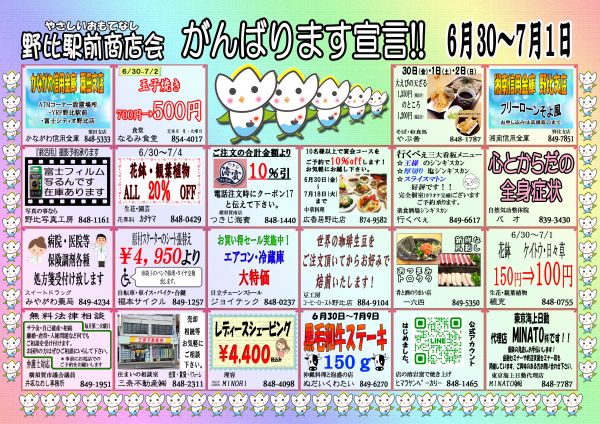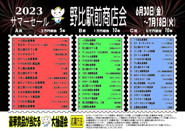 野比駅前商店会では季節ごとにSALEを行ってます。 また、餅つきや盆踊りなどさまざまなイベントも盛りだくさんです。 今年で商店会も40年を迎えましたますますがんばります。