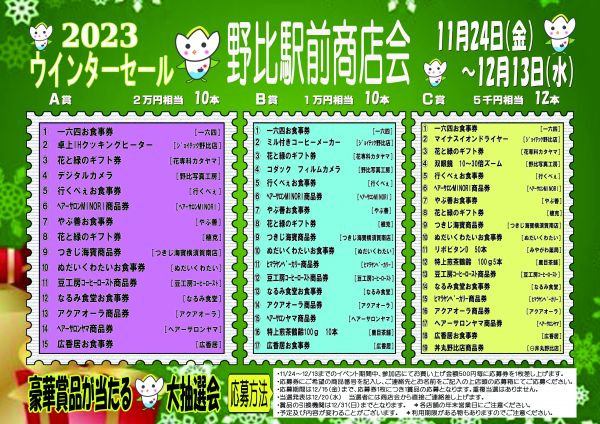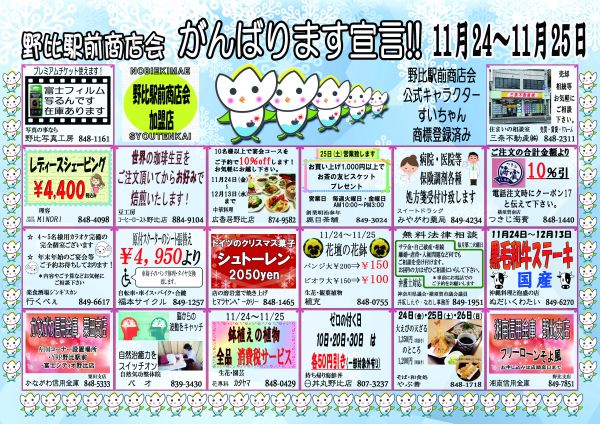野比駅前商店会では季節ごとにSALEを行ってます。 また、餅つきや盆踊りなどさまざまなイベントも盛りだくさんです。 今年で商店会も40年を迎えましたますますがんばります。