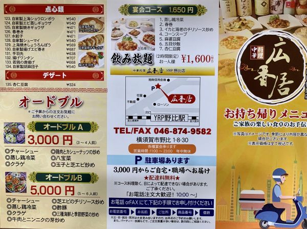 住所 :横須賀市野比 1-8-30 電話番号:046-874-9582 営業時間:11:00 ~ 23:00 定休日 :年中無休 駐車場 :有(6台) 定番料理から変わり種まで幅広い品数をご用意しております! 飲み物も紹興酒,麦焼酎,芋焼酎など種類豊富に揃えております! 年中無休,昼休みなしで営業しております! 皆さまのお越しをお待ちしております!