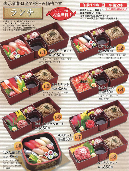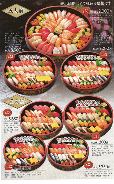 ■住所:横須賀市野比1-19-7 ■TEL:046-848-1440 ■営業時間:午前11時〜午後8時45分 ■定休日:無休 ■HP:http://sunrise-service.co.jp 旬、ひとすじ。 お電話をいただき、すぐに製造速配30分にて、新鮮出来たてをお届致します。 ご家族や職場でランチメニューも実施していますので、ぜひご連絡ください。 まごころ込めてお届けに伺います。 【おすすめメニュー】 ■A-50(5人前)12000円 豪華です(中トロ、真鯛、ホタテ、カニ、ヒラメ、数の子、サーモン、赤エビ、マグロ、エビ、ウニ、イクラ、玉子) ■A-33(3人前)5680円 3人前の定番(中トロ、カニ、真鯛、マグロ、サーモン、ハマチ、エビ、ヒラメ、ホタテ、甘エビ、穴子、玉子、ウニ、イクラ) ■B-18 1480円 1人前。10月からの新メニュー(マグロ、ヒラメ、サーモン、ネギトロ、エビ、ハマチ、穴子、タコ、小肌) ■B-19 1890円 1人前。10月からの新メニュー(中トロ、ヒラメ、サーモン、マグロ、真鯛、数の子、甘エビ、ホタテ、イクラ、ネギトロ) ■L1〜8 850円〜950円 ランチメニューはシャリ・そば大盛り無料!新鮮なネタと香り立つ蕎麦のおいしい共演。お客様思いの感謝プライスで、 ボリューム満点をご堪能いただけます。